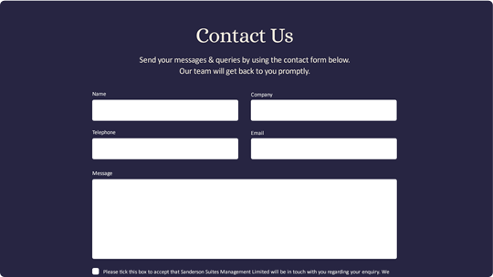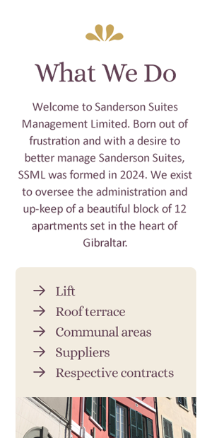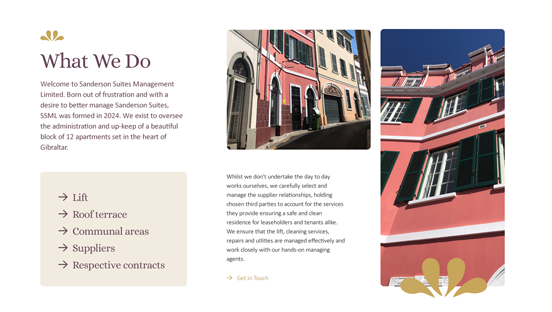 Sanderson Suites Management Limited, overseeing a boutique set of 12 apartments in the heart of Gibraltar (Governors' Street) wanted a website that clearly presents their service offering with a clean, professional design. We created a sleek, one page site highlighting key services, the team behind the management, and the high standards maintained for leaseholders and tenants.The site focuses on essential information without overwhelming visitors, making it easy to understand the service offering at a glance, while encouraging direct contact for further enquiries.